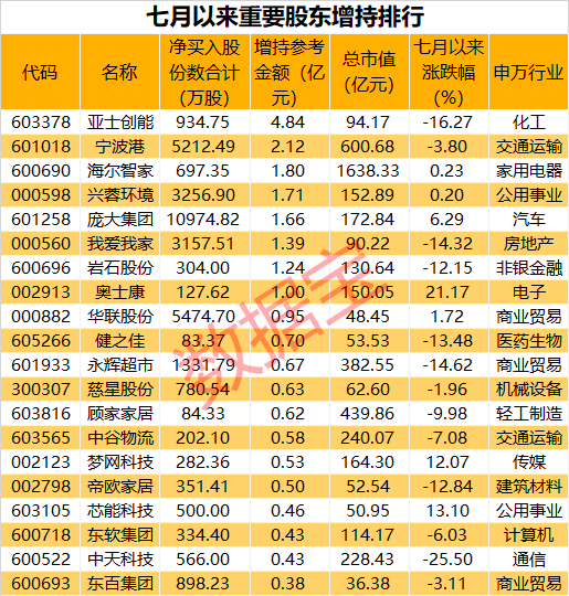 数据宝统计显示,7月以来共有112只个股获重要股东增持,500只个股获重要股东减持,增持标的相对来说较为稀缺。以公告披露的股份变动期间均价计算,49股获股东增持超千万元,7股获股东增持均超1亿元,分别是亚士创能、宁波港、海尔智家、兴蓉环境、庞大集团、我爱我家、岩石股份。