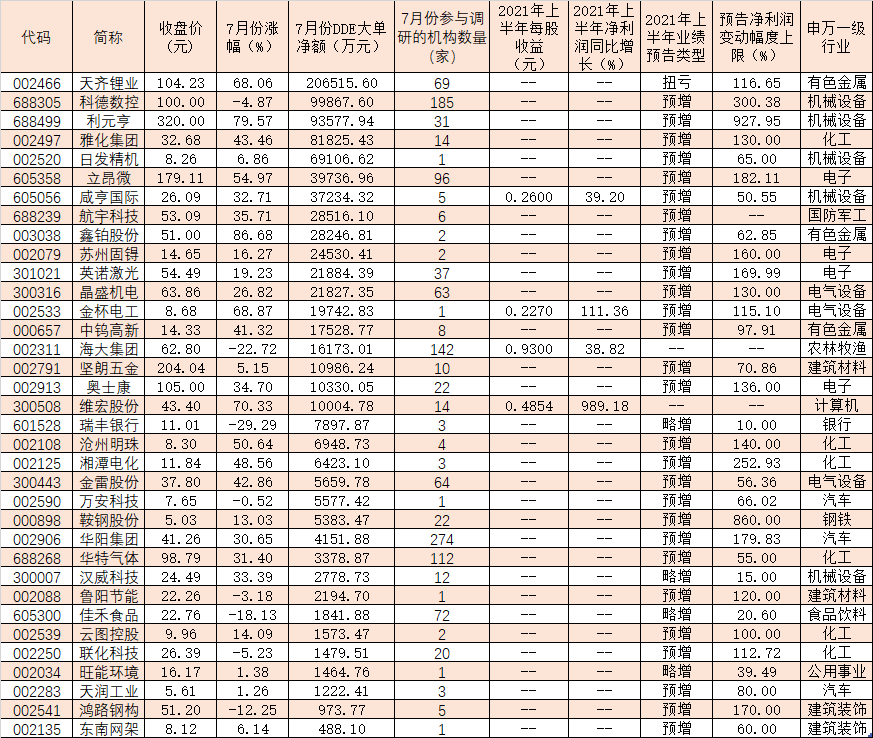 表:7月份获大单资金追捧的2021年上半年净利润实现或有望实现同比增长个股