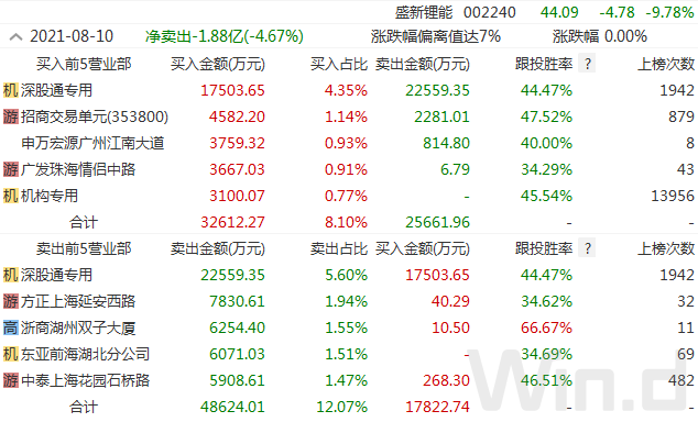 从盘后龙虎板来看,对锂电板块公司机构依旧分歧巨大。8月10日,锂电隔膜龙头恩捷股份盘中一度跌停,收盘亦大幅下跌9.41%,龙虎榜显示,两家机构席位合计净买入超9000万元,深股通席位买入4.3亿,卖出3.89亿,净买入约4000万元,此外,一机构席位净卖出8700多万元。