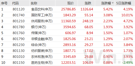 从8月10日涨幅居前的板块来看,食品饮料板块涨幅达5.42%,位居首位;国防军工、休闲服务、银行等板块紧随其后。