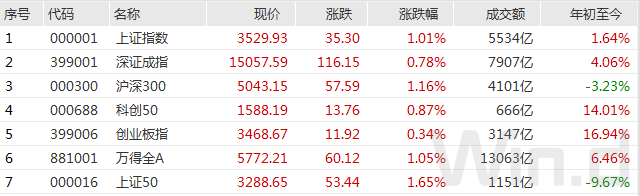 截至8月10日收盘,上证指数涨1.01%报收于3529.93点;深成指涨0.78%报收于15057.59点;创业板指涨0.34%报收于3468.67点,万得全A总成交1.31万亿。