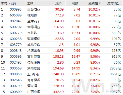 其中,皇台酒业、味知香、盐津铺子、舍得酒业、水井坊、海南椰岛、威龙股份、承德露露等多股涨停,而白酒股作为绝对主力,泸州老窖、五粮液、山西汾酒等多家2000亿市值以上白酒龙头涨幅均超过7%。