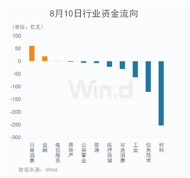 从8月10日行业资金流向来看,主力资金净流出400多亿元,多数行业净流出。其中材料板块净流出超250亿元,位居首位;信息技术板块净流出额亦超100亿元,紧随其后。日常消费板块则大幅净流入超50亿元,金融板块亦小幅净流入。