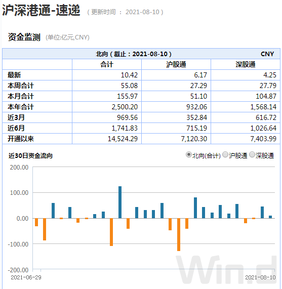 8月10日,北上资金净流入10.42亿元,连续两天小幅净流入,本周累计净流入55.08亿元。从近期北上资金的动向来看,近期呈现小幅连续流入态势。