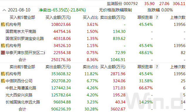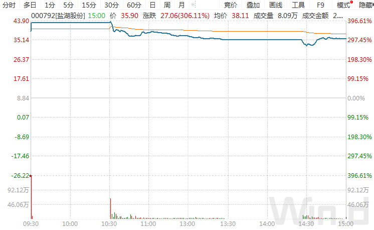 8月10日,盐湖股份恢复上市首日,在“盐湖提锂”的加持下,大幅高开343.6%开盘,并快速拉升至涨幅达388%,较开盘价首次上涨超过10%,触发临时停牌。停牌一小时后,盐湖股份恢复交易,其后一路低走,到下午1点半左右,由于较开盘价跌10%,再次触发临时停牌。截至收盘,涨306.11%,报35.9元/股,总市值1950亿元。