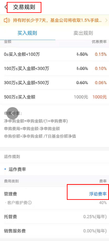 还是以金鹰民族新兴为例,该基金申购费率为0.15%,持有7天以上180天以下赎回费率为1%,销售服务费为0,托管费率为0.25%,固定管理费率为0.8%,附加管理费率为按5%的基准如下图进行收取。
