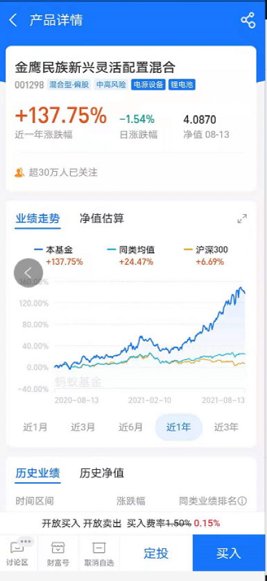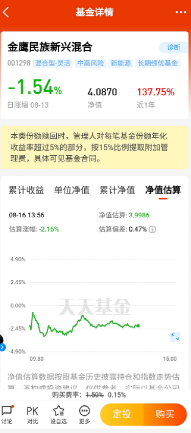 基金君发现,有的平台对“收取附加管理费”进行了专门提示。比如天天基金app,进入金鹰民族新兴页面后,上方位置用显著色块进行标注:本类份额赎回时,管理人对每笔基金份额年化收益率超过5%的部分,按15%的比例提取附加管理费。