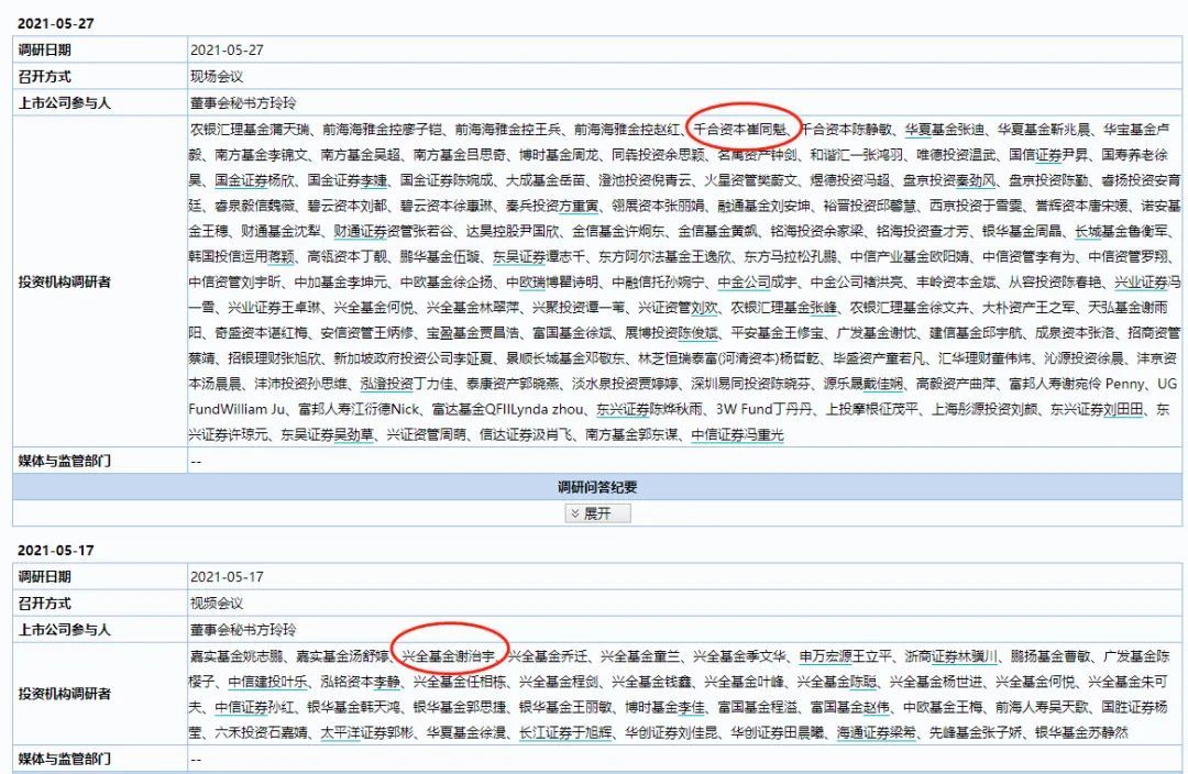 而在此前已经披露的多次机构调研名单中,王亚伟旗下的私募千合资本两度调研,顶流基金经理谢治宇也现身调研名单当中。