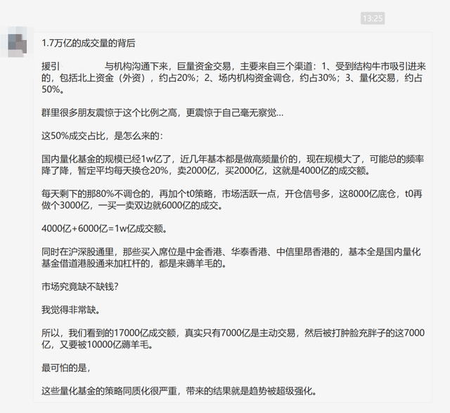 机器无情人有情。以A股一天1.4万亿交易额为例,若有50%的量化交易,意味着其中7000亿是量化“水军”在刷数据。