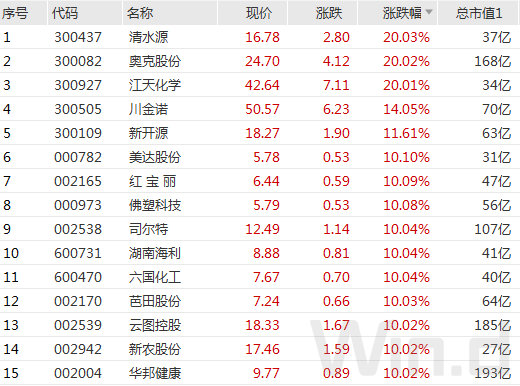 其中化工板块涨停或涨幅超过10%的个股超过30家,其中,清水源、奥克股份、江天化学等3公司20CM涨停。