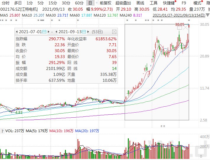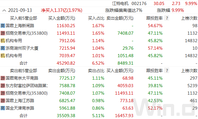 新能源板块的江特电机,7月份以来累计涨幅达290%,9月13日再度放量涨停,盘后龙虎榜数据显示,2家机构席位合计净买入约1.4亿元,而卖出席位皆为游资。