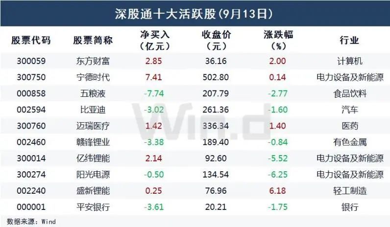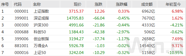 截至9月13日收盘,上证指数涨0.33%报收于3715.37点;深成指跌0.45%报收于14705.83点;创业板指跌1.17%报收于3194.27点,万得全A总成交1.45万亿。