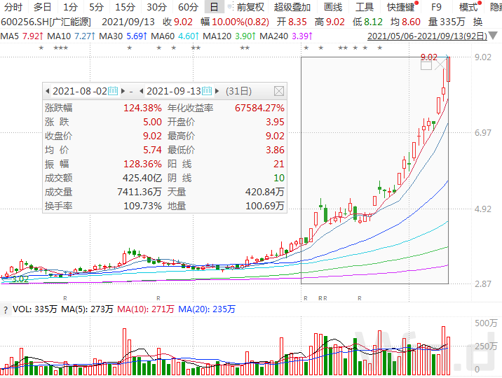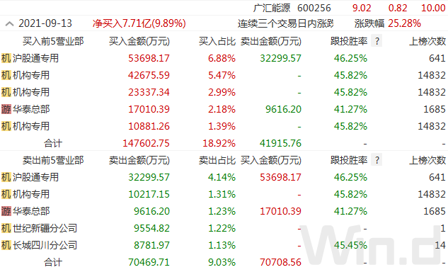 受益于油、气、煤涨价的广汇能源,近期股价火箭发射,8月份以来,股价累计涨幅超过120%。9月13日公司股价再度涨停,而从盘后龙虎榜来看,沪股通席位净买入超2亿元,3机构席位合计净买入超7.6亿元。
