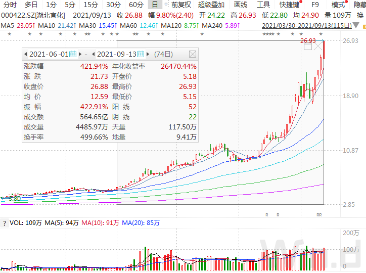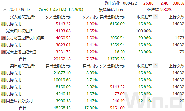 对于化工板块的湖北宜化,机构则且战且退。6月份以来,公司股价累计涨幅超420%,9月13日再度上涨近10%,盘后龙虎榜数据显示,4家机构席位合计净卖出约3.8亿元。