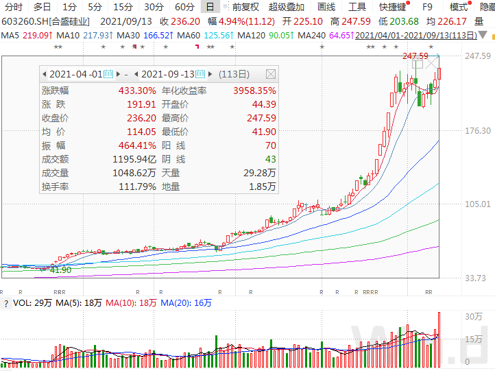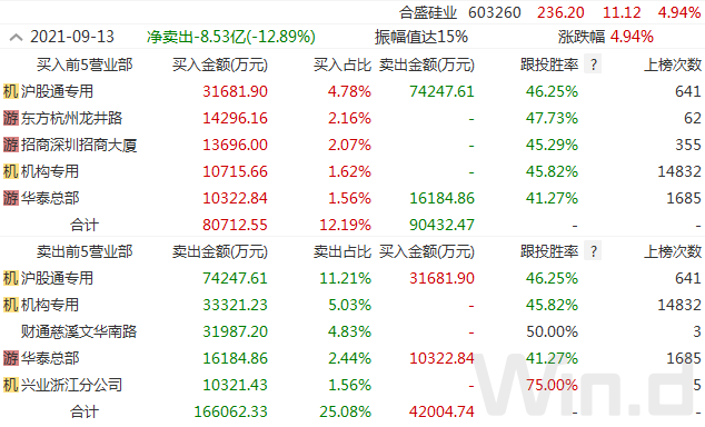 9月13日,合盛硅业股价巨幅震荡,早盘一度逼近跌停,而午后却逆转一度涨停,收盘仍大幅上涨近5%。盘后龙虎榜数据显示,沪股通席位净卖出超4亿元,1机构席位净卖出超3亿元,同时也有1机构席位净买入超1亿元。