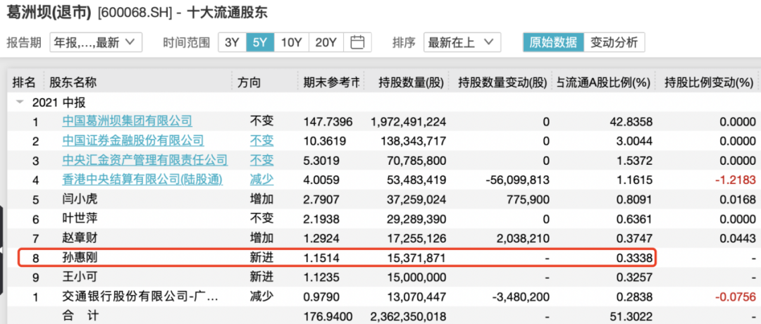 有意思的是,最为市场所关注的牛散孙惠刚也出现在了前十大流通股东中。孙惠刚是在2021年二季度才出现在葛洲坝前十大流通股东之列,截至2021年6月末,其持有葛洲坝1537.19万股,持仓市值达1.53亿元。