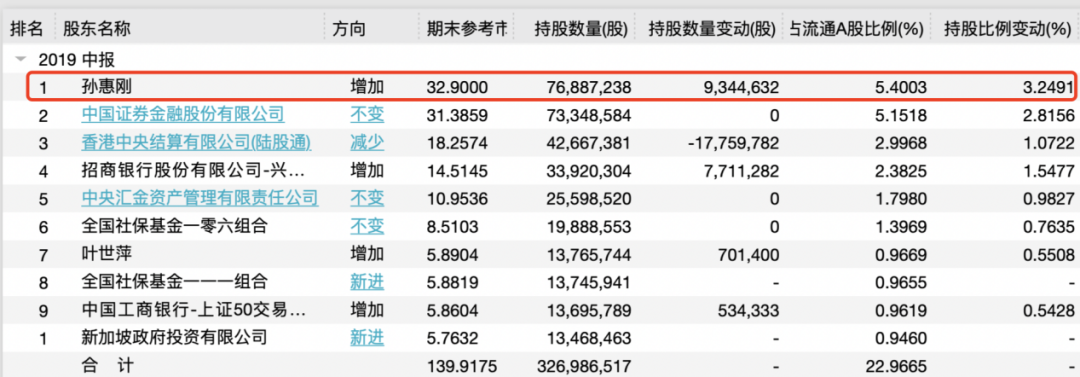 至2019年一季度,孙惠刚再度大举加仓4022万股,期末累计持仓达6754万股,一跃成为万华化学第二大流通股东。2019年二季度,孙惠刚继续加仓934万股,累计持仓7688万股,占流通股比5.4%,成为第一大流通股东,随后一直耐心持有。