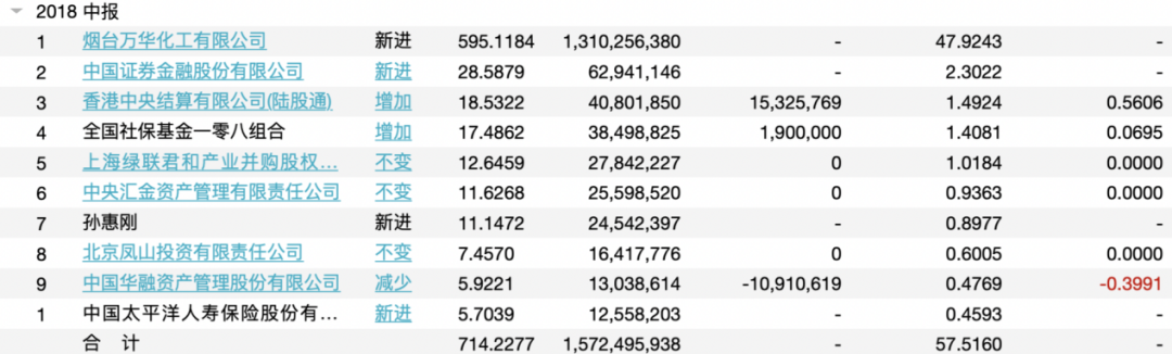 2018年二季度,孙惠刚的名字首次出现在万华化学前十大流通股东名单之列,重仓买入2454万股,成为十大股东中唯一的自然人。由于2018年上半年前几个月万华化学一直处于停牌状态,6月份股票均价则在42元附近,可以将孙惠刚的持仓成本粗略估算为40元左右。