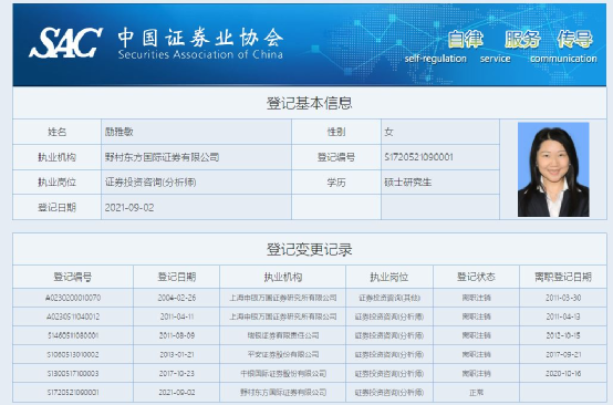 中国证券业协会官网显示,励雅敏目前执业机构已经更新为野村东方,登记日期为今年9月2日。