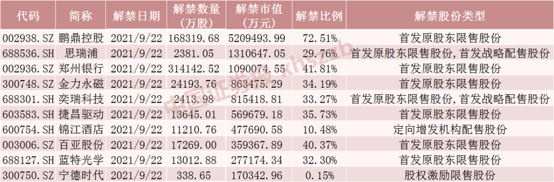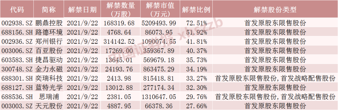 具体来看,Wind数据显示,鹏鼎控股9月22日将解禁16.83亿股,均为首发原股东限售股份。思瑞浦9月22日将解禁2381.05万股,为首发原股东限售股份和首发战略配售股份。郑州银行9月22日将解禁31.41亿股,均为首发原股东限售股份。