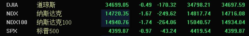 美股低开之后,继续低走,纳指跌去近250点。(编者注:三大指数集体收跌,纳指连跌三日,跌幅2.83%,报14546.51点,创8月19日以来新低,并创3月18日以来最大收盘跌幅。标普500连跌两日,收跌2.06%,报4352.63点,创9月14日以来新低,并创5月12日以来最大收盘跌幅。道指结束四日连涨,收跌569.38点,跌幅1.63%,报34299.99点,创9月20日以来最大收盘跌幅,处于最近四个交易日最低水平。)