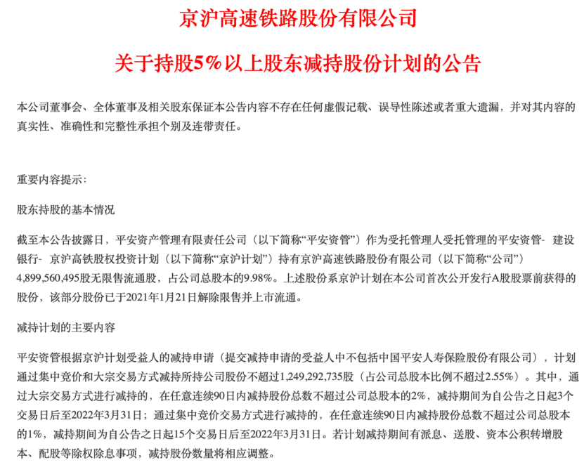 “京沪计划”拟减持京沪高铁不超12.49亿股 平安资管回应目前无减持计划