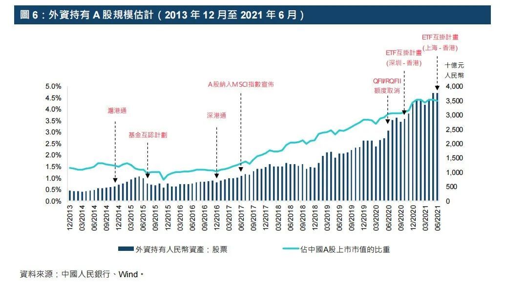 值得注意的是,随着QFII、RQFII、沪港通、深港通、内地与香港基金互认计划、粤港澳大湾区跨境ETF等一系列政策的落实,叠加全球主要指数相继纳入中国A股,国际投资者参与A股的渠道显著增加,持有A股的规模快速增加。尤其是过去三年,外资迅速流入A股。