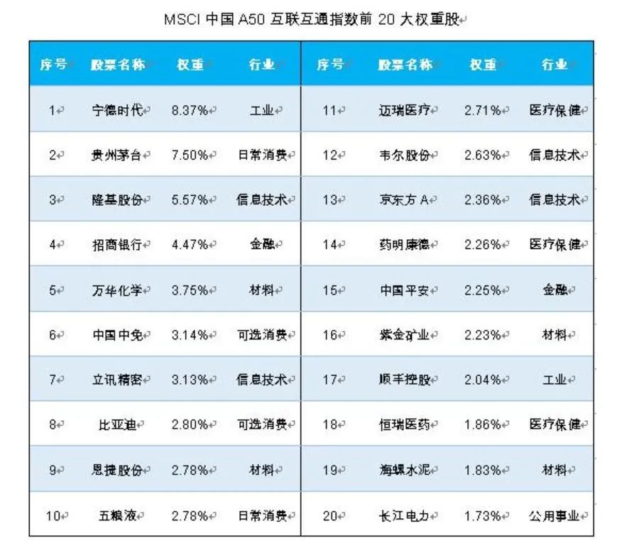 具体来看,前十大成分股中,宁德时代位列第一,指数比重为8.37%,贵州茅台位列第二,指数比重为7.50%,隆基股份位列第三,指数比重为5.57%;其他个股还包括万华化学、中国中免、立讯精密等。