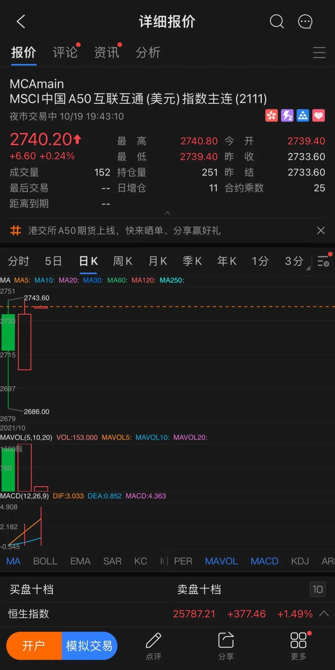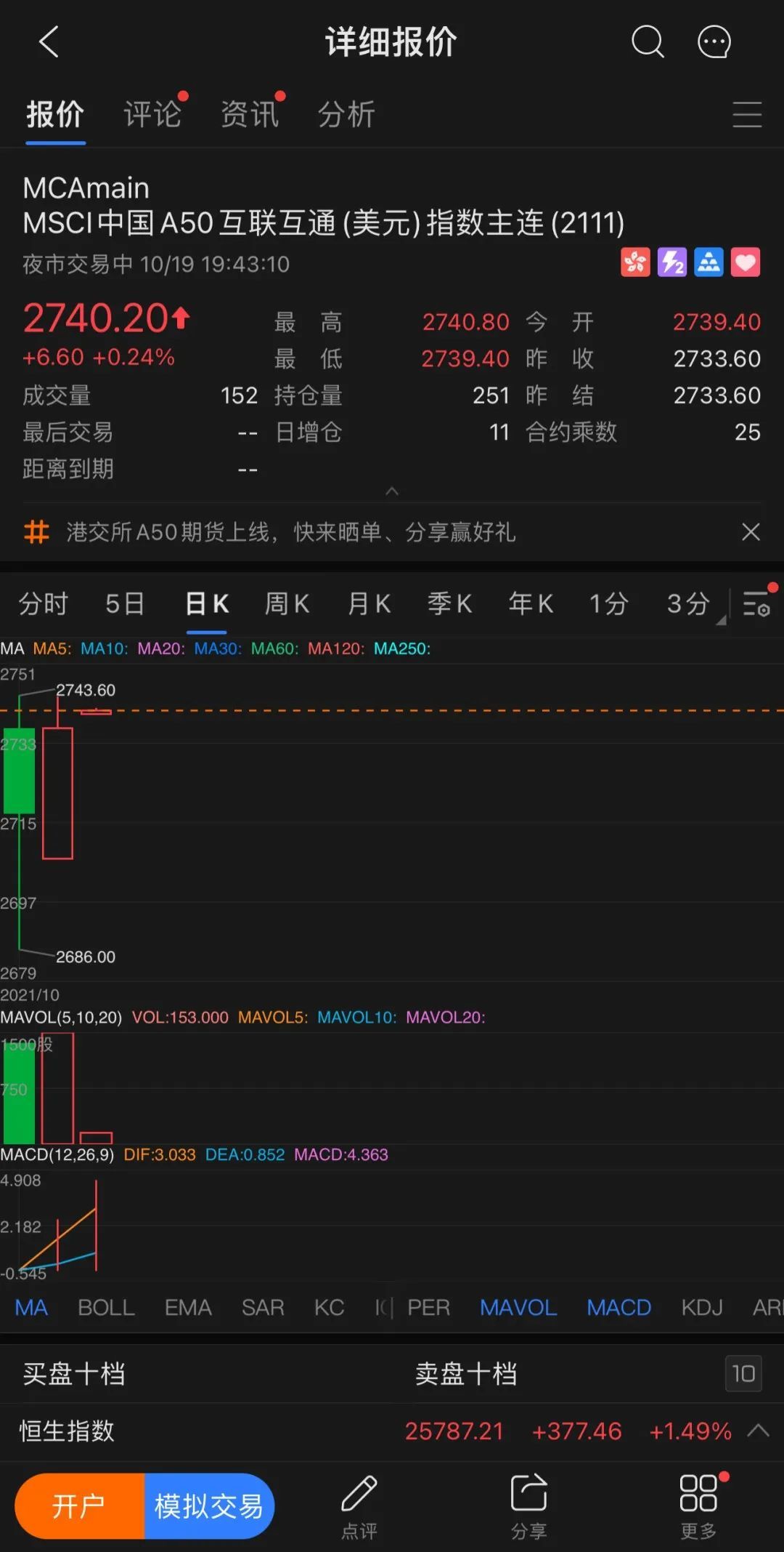 由于标的“MSCI中国A50互联互通指数”贴合A股指数的行业板块权重,兼顾“宁组合”与“茅指数”,其中茅台和五粮液的合计占比达到10%,而白酒板块当日刚好遭遇重挫,使得该期货合约未实现“开门红”,主力合约开盘价为2736,收盘下跌0.69%,全天成交1395张,人民币名义成交金额为6.3亿元。10月19日,港交所A50期货主力合约强势上涨,收盘涨0.71%,成交1499张。