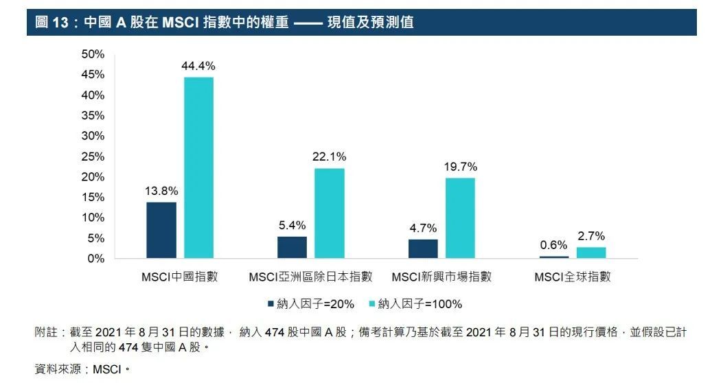 按备考基准计算,在纳入因数为100%的情况下,中国A股占MSCI中国指数、MSCI亚洲区除日本指数、MSCI 新兴市场指数与MSCI全球指数的权重可能会分别达到44.4%、22.1%19.7%与2.7%。