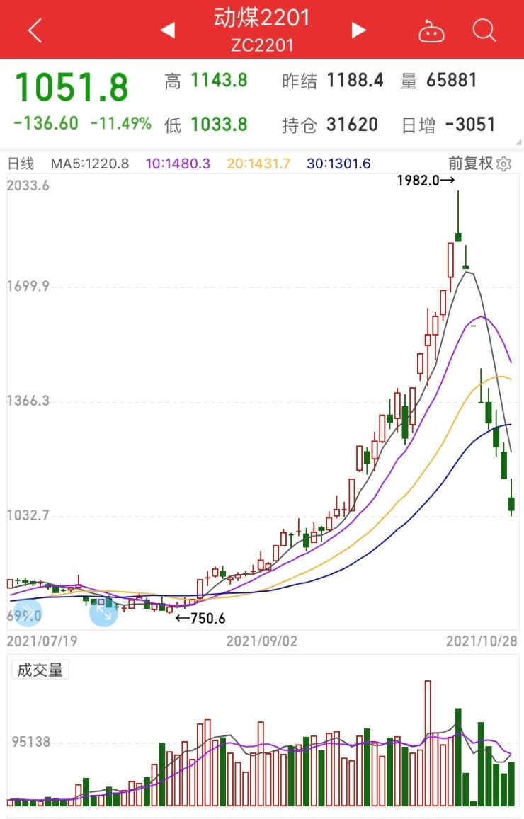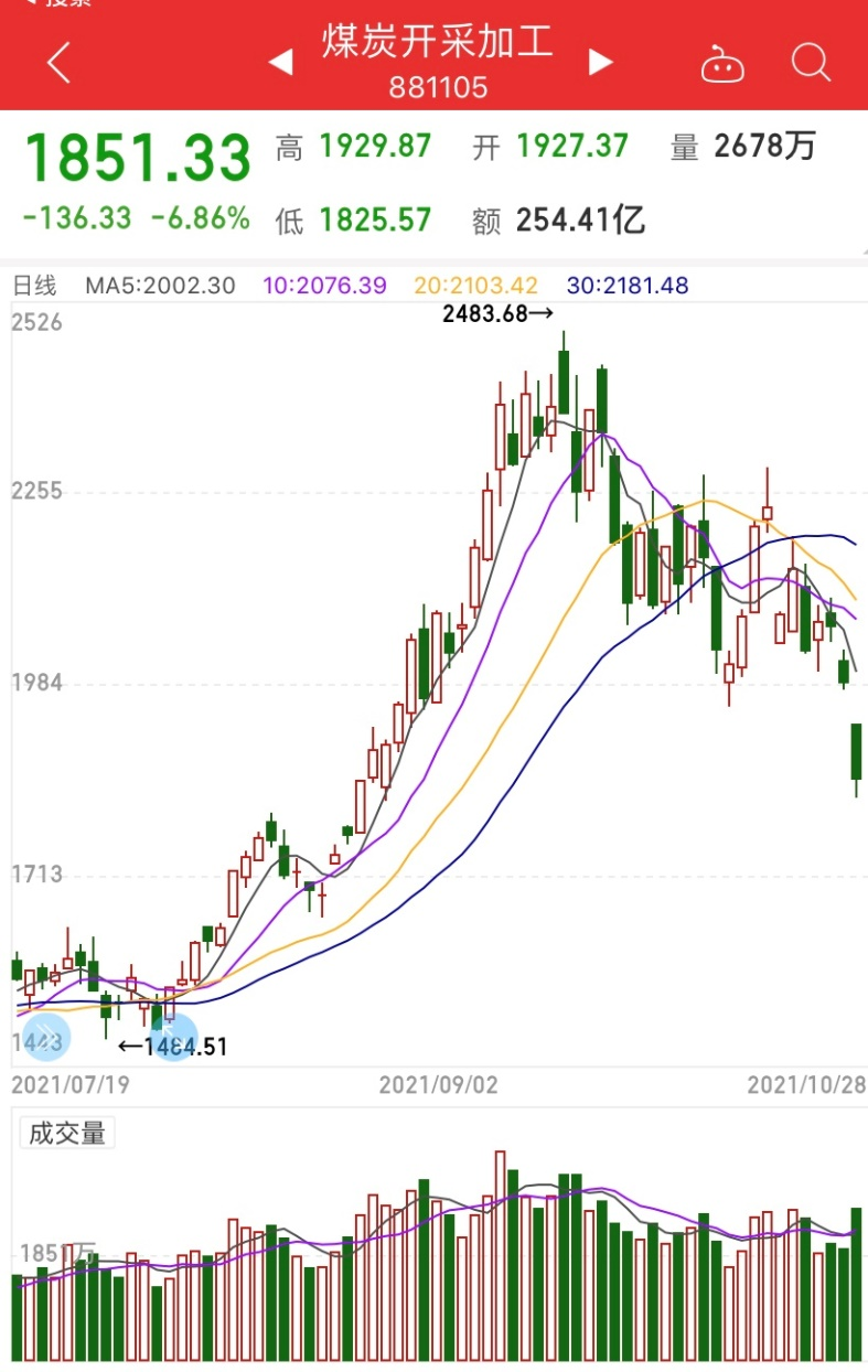 一系列监管政策的强力威慑下,疯狂的煤炭市场正朝向合理的方向回归。截至28日收盘,动力煤期货主力合约报价1051.8元/吨,较本月19日创下的1982元/吨的历史新高近乎“腰斩”。自监管层10月19日首度对煤价传出干预信号后,动力煤期货已连续第七个交易日下跌。截至28日收盘,A股煤炭开采加工板块大跌近7%,自9月16日至今板块整体跌幅超过20%。