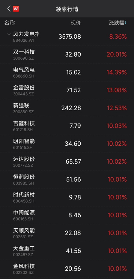 风电股掀起涨停潮,双一科技20CM涨停,电气风电、金雷股份、新强联、吉鑫科技、明阳智能、运达股份、恒润股份、时代新材、中闽能源、天顺风能、大金重工、金风科技、振江股份等多股封涨停板。