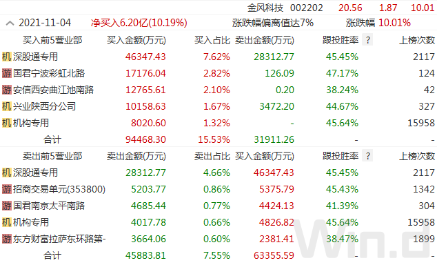 11月4日,风电整机龙头金风科技涨停,盘后龙虎榜数据显示,深股通净买入1.8亿元,一个机构席位买入8021万元,且多个知名游资席位大笔买入。