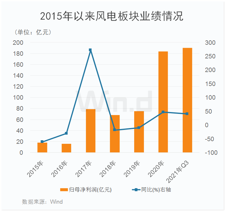 从近几年风电板块业绩表现来看,呈现出较大幅度波动,整体来看最近两年业绩明显好转,2021年前三季度板块实现归母净利润超过190亿元,超过2020年全年业绩,2021年全年业绩大幅上涨已无悬念,这或许是当前风电板块强势拉升的底气所在。