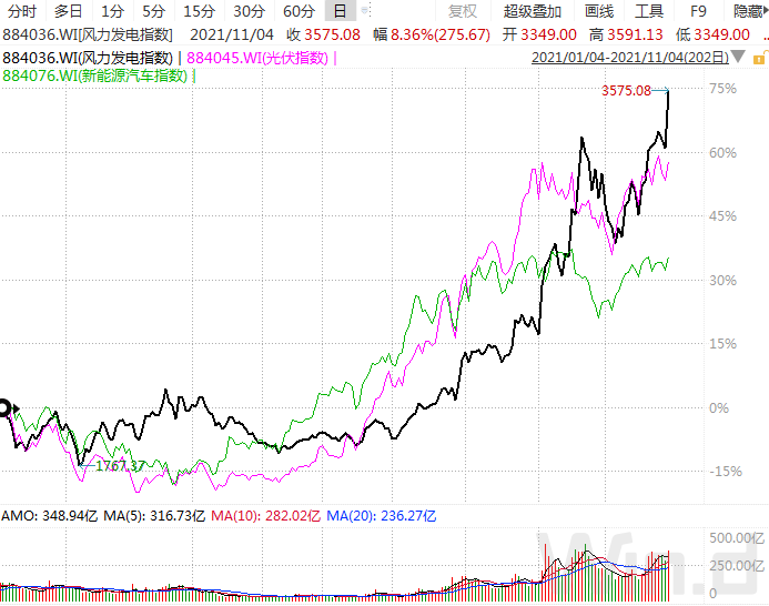 从今年以来风力发电、光伏、新能源汽车板块走势对比来看,基本保持同步上涨态势,涨幅均超过30%,风力发电和光伏涨幅甚至超过50%。特别是最近几天,风力发电表现明显更强,成为新能源产业链领涨板块。