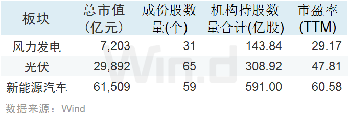 从风力发电、光伏和新能源汽车三大板块三季机构持股来看,风力发电机构持股数为143.84亿股,而光伏和新能源汽车机构持股数分别为308.92亿股和591亿股。考虑到风电板块的体量在三大板块中最小,总市值仅7203亿元,远小于光伏和新能源汽车板块,且公司数量也是最少的,因此机构持股数与板块规模成正比。