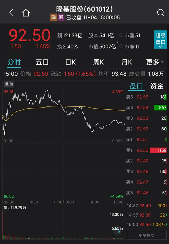11月4日,“光伏茅”隆基股份早盘一度涨逾4.5%,午后震荡回落,收涨1.65%报92.5元。