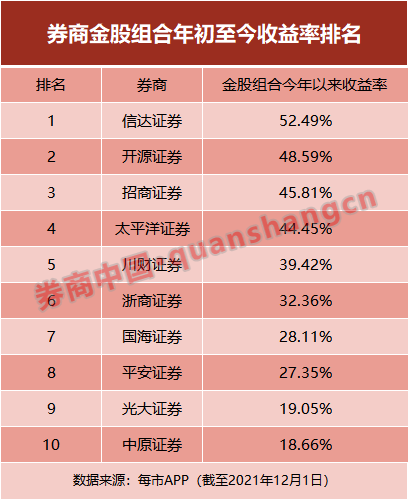 从各券商金股组合今年的收益率表现来看,截至12月1日收盘,信达证券、开源证券、招商证券位居前三。具体来看,信达月度金股组合今年以来收益率超50%,开源证券、招商证券金股组合涨超45%,太平洋证券也以超40%的收益率位居第四。