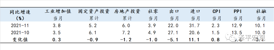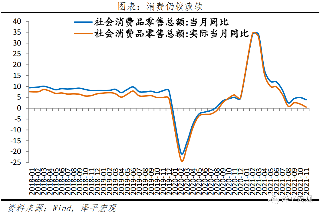 4、消费受疫情、就业、收入、复苏K型分化影响,仍疲软。11月社会消费品零售总额两年复合增长4.4%,较上月下降0.2个百分点;扣除价格因素,实际两年复合同比3.3%,较上月上升0.1个百分点。分品类看,必需消费品和升级类消费品表现强劲;石油制品类消费受能源价格上涨拉动;汽车仍造成拖累,除汽车以外的消费品两年复合同比5.4%。