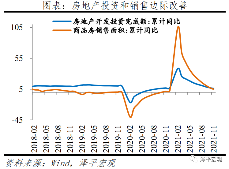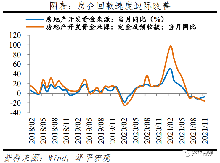 房企销售和资金回笼速度持续负增长、但降幅收窄,11月商品房销售面积和销售额同比分别为-14.0%和-16.3%,分别较10月回升7.7和6.3个百分点。11月房地产开发资金来源同比-7.0%,较10月回升2.5个百分点。1)居民对房企不信任情绪和对房市观望态度仍存,11月销售同比延续负增长,根据克尔瑞数据11月全国前100房企单月实现销售操盘金额7507.8亿元,较10月环比回落3.4%,较去年11月同比-37.6%。2)房企资金回笼速度整体来看仍较慢,但除定金外其他主要资金来源回笼速度均边际改善。11月房企从国内贷款、自筹资金、定金及预收款、个人按揭贷款到位的开发资金同比分别为-20.5%、2.1%、-16.1%和10.6%,分别较10月变化6.7、4.9、-3.2和9.6个百分点。9月底房地产金融工作座谈会提出“保持房地产信贷平稳有序投放”后,中央接连对房地产市场释放积极信号,12月3日银保监会表示,“要根据各地不同情况,重点满足首套房、改善性住房按揭需求,合理发放房地产开发贷款、并购贷款,加大保障性租赁住房支持力度,促进房地产行业和市场平稳健康发展”。