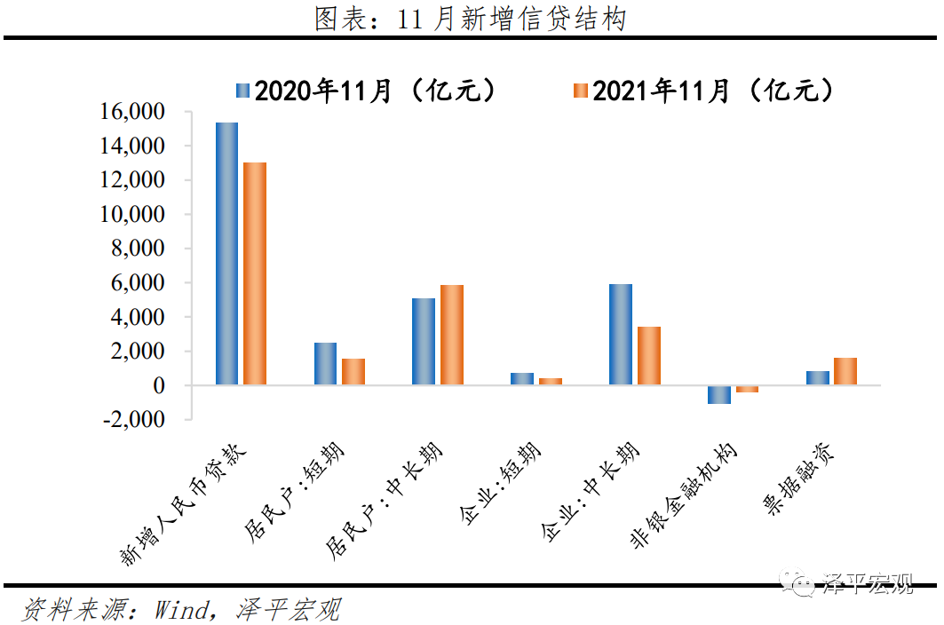 11月金融机构口径信贷余额同比增速为11.7%,较上月回落0.2个百分点。新增人民币贷款1.27万亿元,同比少增1600亿元;新增企业贷款5679亿元,同比少增2133亿元。短期贷款、中长期贷款、票据融资同比分别少增324亿元、少增2470亿元、多增801亿元;新增居民贷款7337亿元,同比少增197亿元。其中,短期贷款新增1517亿元,同比少增969亿元,中长期贷款新增5821亿元,同比多增772亿元。