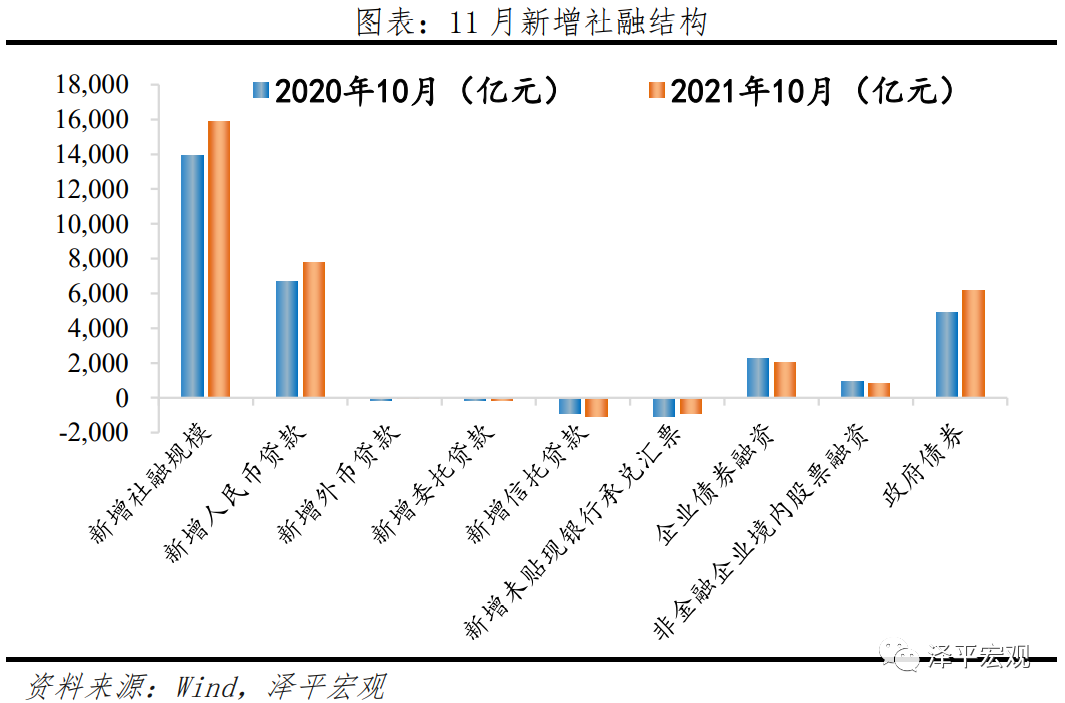 从社融结构来看,政府债、企业债券和股票融资为支撑项。11月新增人民币贷款1.3万亿元,同比少增2288亿元,成为主要拖累;表外融资减少2538亿元,同比多减495亿元。其中,新增未贴现票据减少383亿元,同比少减242亿元,延续边际修复。信托贷款净融资下滑2190亿,同比多减803亿。委托贷款增加35亿元,同比多增66亿元;政府债券净融资8158亿元,同比大幅多增4158亿元,专项债发行明显提速,发行进度已达96.8%,超过去年同期的94.6%,财政部要求“专项债券额度尽量在11月底前发行完毕”基本实现;企业债券净融资4104亿元,同比大幅多增3264亿元,一方面是基数原因,去年同期“永煤违约”企业发债大幅缩水,另一方面城投、地产债券发行回暖,地产债发行规模自8月以来首次出现环比回升;11月新增股票融资1294亿元,同比多增523亿元,环比增加448亿元,主因本月有多笔大额定向增发融资上市。