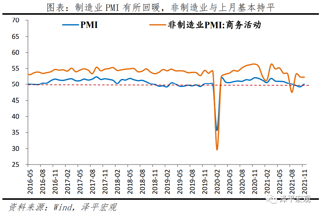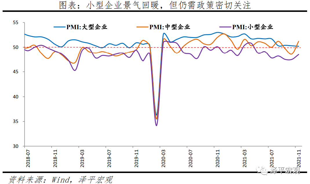11月大、中、小型企业PMI分别为50.2%、51.2%和48.5%,较上月变动-0.1、2.6和1.0个百分点。小型企业经营指标有所修复,但压力仍在。小型企业新订单指数为47.6%,较上月回升1.5个百分点;新出口订单46.6%,回升5.3个百分点;小型企业经营预期为51.9%,回升2.5个百分点。