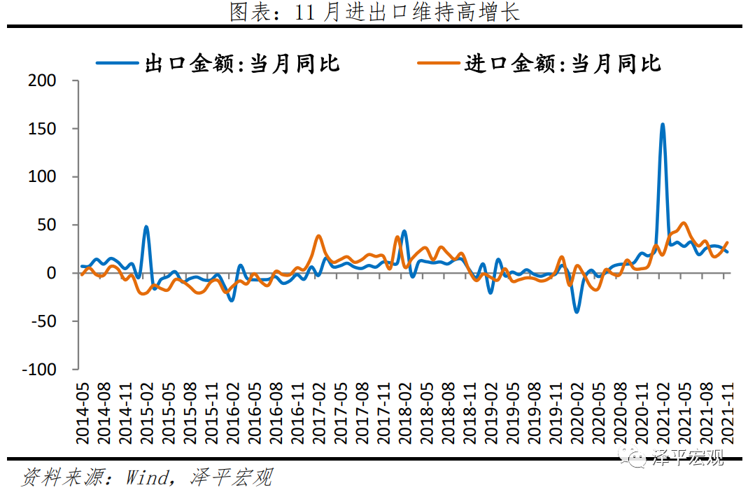 11月中国出口额(以美元计,下同)3255.3亿美元,同比增22.0%,两年复合增速21.2%,较上月上升2.5个百分点。 出口仍处于高位,主要有三点原因: 一是外需仍然维持高景气,11月美国Markit制造业PMI为58.3%,欧元区、德国制造业PMI分别为58.4%和57.6%,韩国11月出口同比27.6%。 二是产能替代效用仍在,国际港口拥堵状态尚未缓解。 三是,原材料价格缓解,带动出口增速上升; 10月数量对出口贡献作用高于价格。