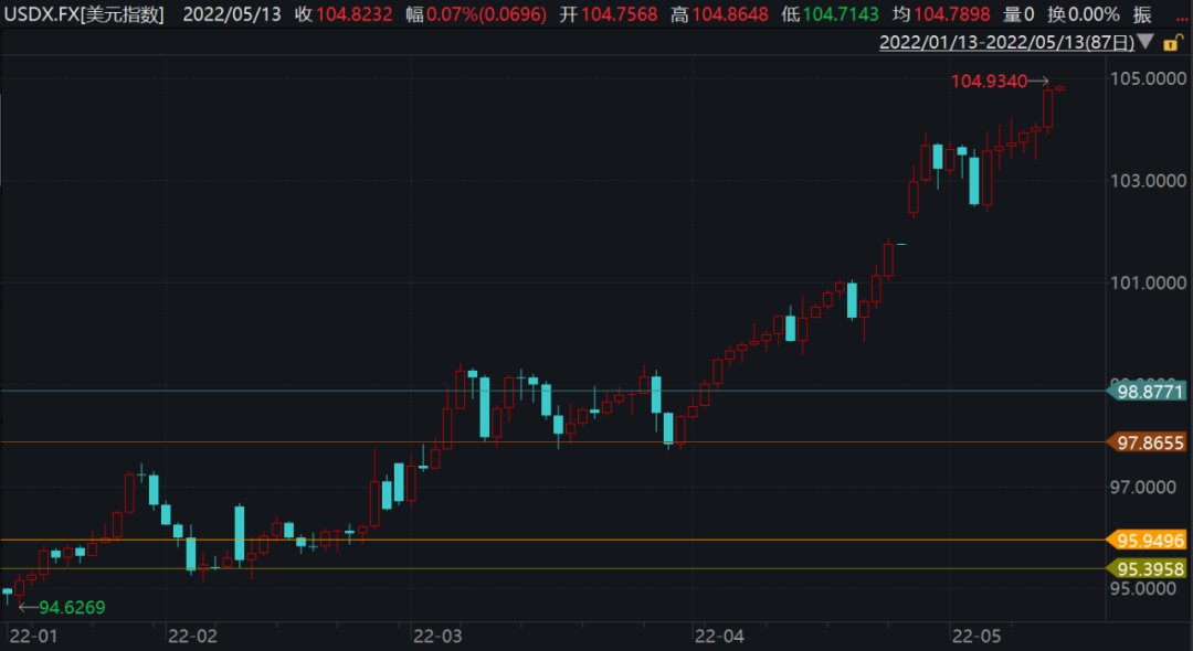 Wind数据显示,4月1日,美元指数从98.57起步快速走强。截至5月12日,美元指数4月以来已累计上涨6.50%。30个交易日里仅有6个交易日略微回调,其余交易日皆上涨,并先后突破100、101、102、103、104关口。12日,美元指数最高报104.93,创2003年初以来新高。