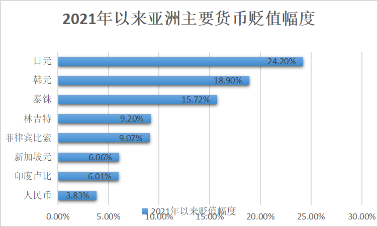 其实,亚洲主要货币自2021年以来已开启贬值,多数货币贬值至数年来最低水平,而人民币汇率在2021年全年保持坚挺,近期才从高位展开回调。