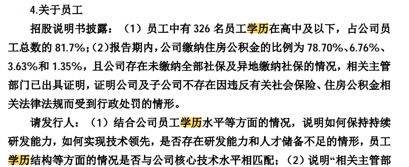 上交所对此提问,“结合公司员工学历水平等方面的情况,说明如何保持持续研发能力,如何实现技术领先,是否存在研发能力和人才储备不足的情形,员工学历结构等方面的情况是否与公司核心技术水平相匹配?”