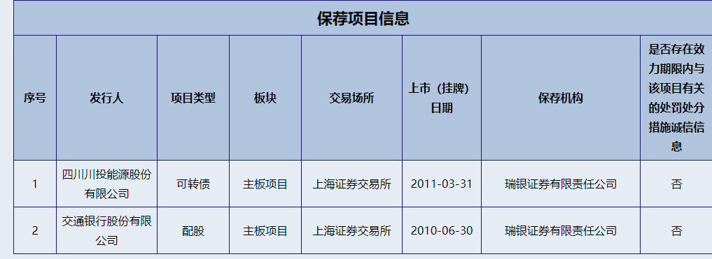公开资料显示,王钦刚自从业以来,一共保荐了2个项目,一个是交通银行股份有限公司“配股”,另一个是四川川投能源股份有限公司“可转债”,而“首发”项目为零。