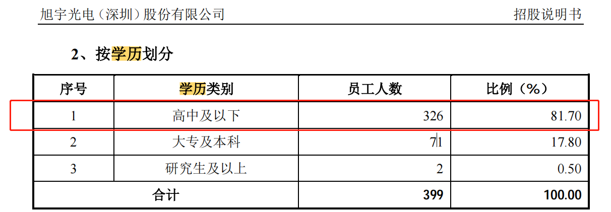 截至2020年6月30日,旭宇光电员工总数为399人,高中及以下员工人数为326人,占比高达81.7%。这意味着,公司近八成员工学历为高中及以下学历。