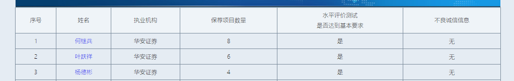 另一位保荐人杨德彬自从业以来,一共保荐了4个项目,是华安证券保荐项目数量第三多的从业人员。